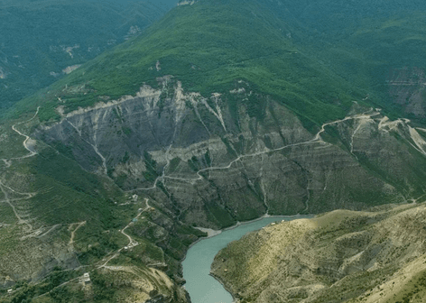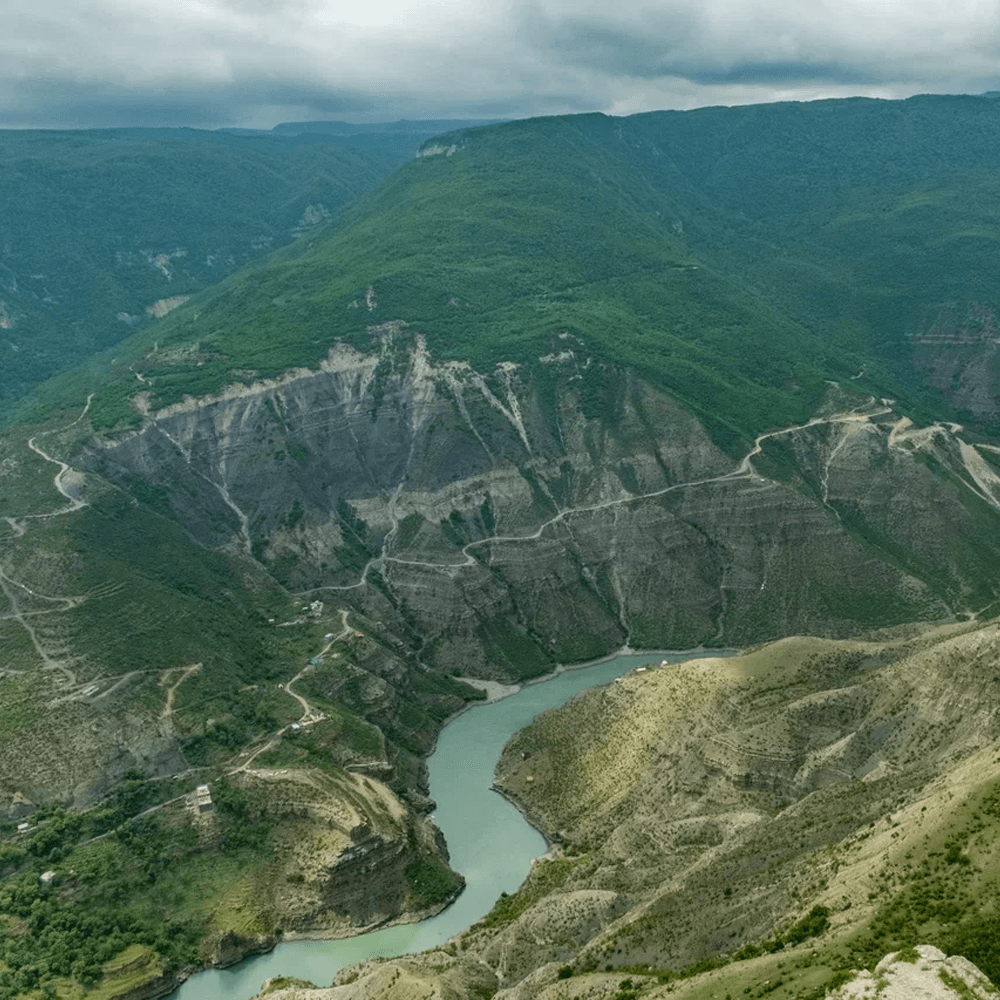 Сулакский каньон. Глубочайший каньон Европы у ваших ног! Загляните в бездну глубиной 1920 метров — это глубже знаменитого Гранд-Каньона! Со смотровых площадок у села Дубки вас ошеломит панорама: извилистая бирюзово-изумрудная река Сулак, зажатая между исполинскими скальными стенами. Масштаб и мощь, от которых захватывает дух!