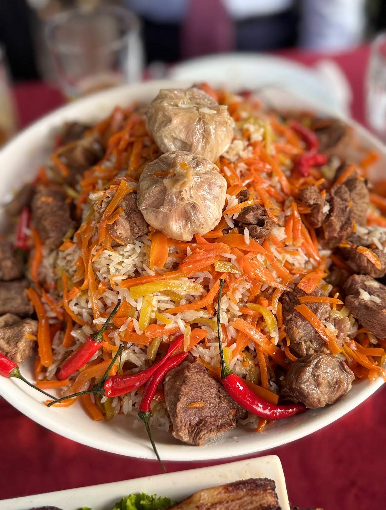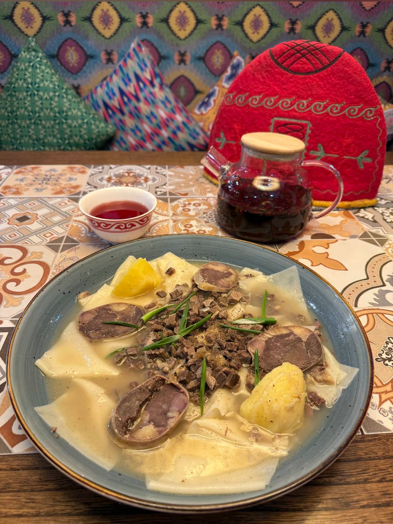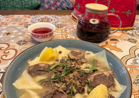 - Национальные блюда: Бешбармак — главное блюдо кыргызской кухни, варёное мясо (обычно конина или говядина) с домашней лапшой. Курдак — жареное мясо с картошкой, ароматное и с дымком. Плов — с сочной морковью, изюмом и ароматным маслом. Лагман — тянутая лапша с мясом и овощами в насыщенном соусе. Манты — большие сочные пельмени на пару. Кумыс — традиционный напиток из кобыльего молока, символ кыргызских гор. Боорсоки — жареные кусочки теста, подаются к чаю.