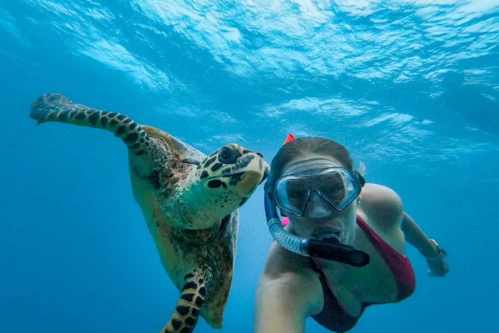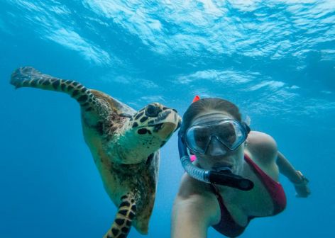 - Подводная съёмка на групповом снорклинге, красивое индивидуальное видео для каждого участника тура с большой морской черепахой и акулами.