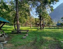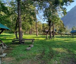 Стоянка большая, с беседками, костровищами и туалетами.