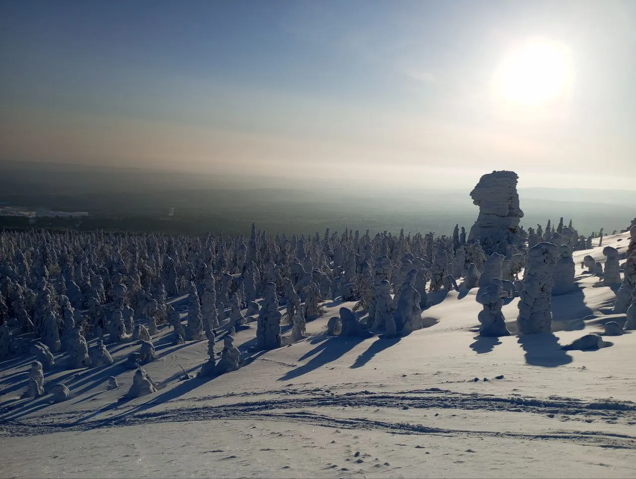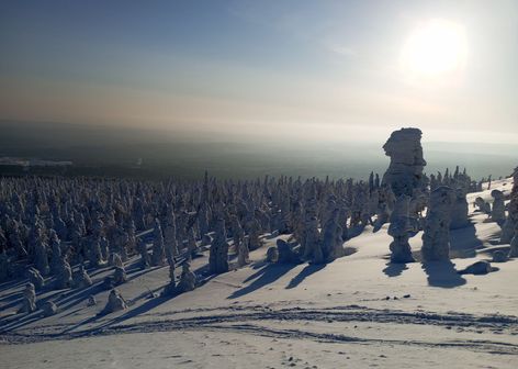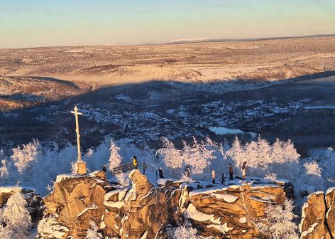 После отправляемся на север Пермского края — в сторону Красновишерска. Дорога займет около пяти часов, но за окном будут сменяться пейзажи заснеженными лесами.