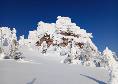 По приезду нас ждет горячий плов и подготовленные снегоходы — начнется настоящее зимнее приключение! Мы поднимемся на вершину горы Полюд, откуда открывается невероятный вид на бескрайнюю тайгу.