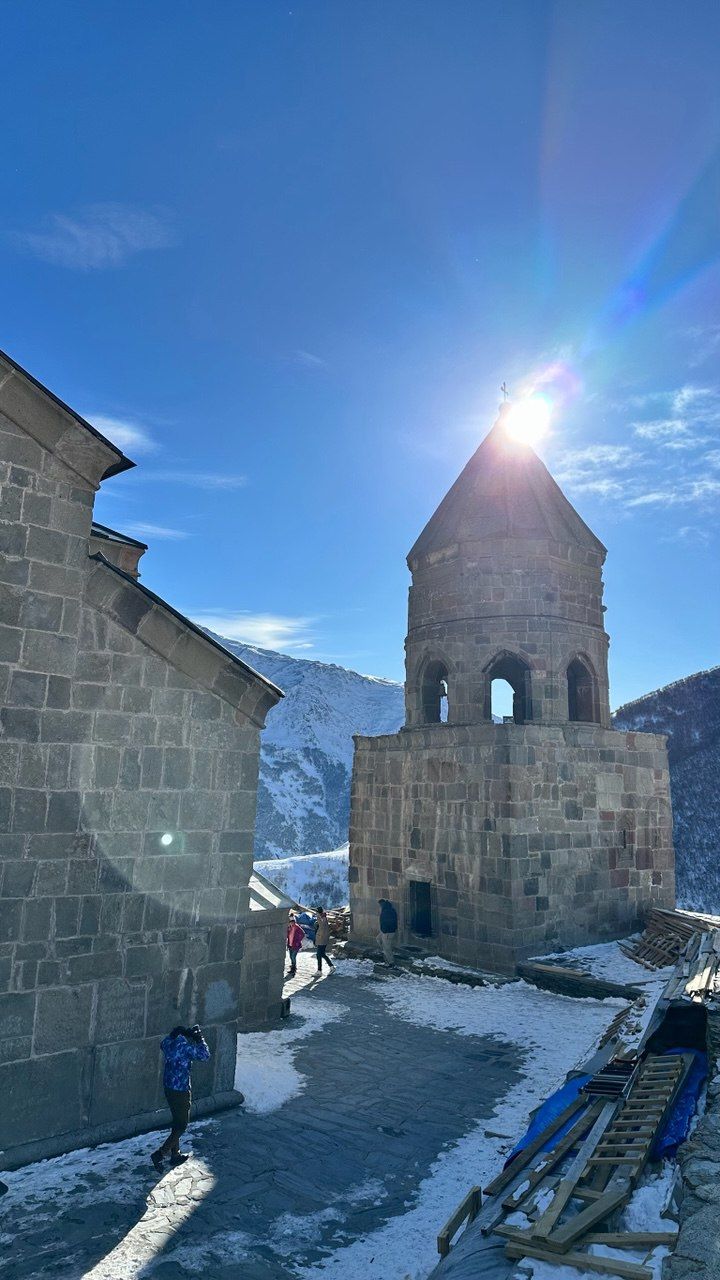 Кульминация путешествия — знаменитая святыня, возвышающаяся на фоне Казбека. Вид отсюда поистине завораживает.