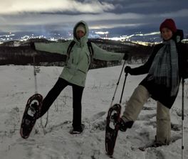 Мы подъедем к сопке Солнечная (305 метров) или Горелая (254 метров) — вечером выберем ту, откуда больше шансов увидеть северное сияние. По снежной тропе (при необходимости на снегоступах) вы совершите восхождение до тундровой зоны. Спуститься можем по обратной стороне сопки к озеру и лесной зоне.