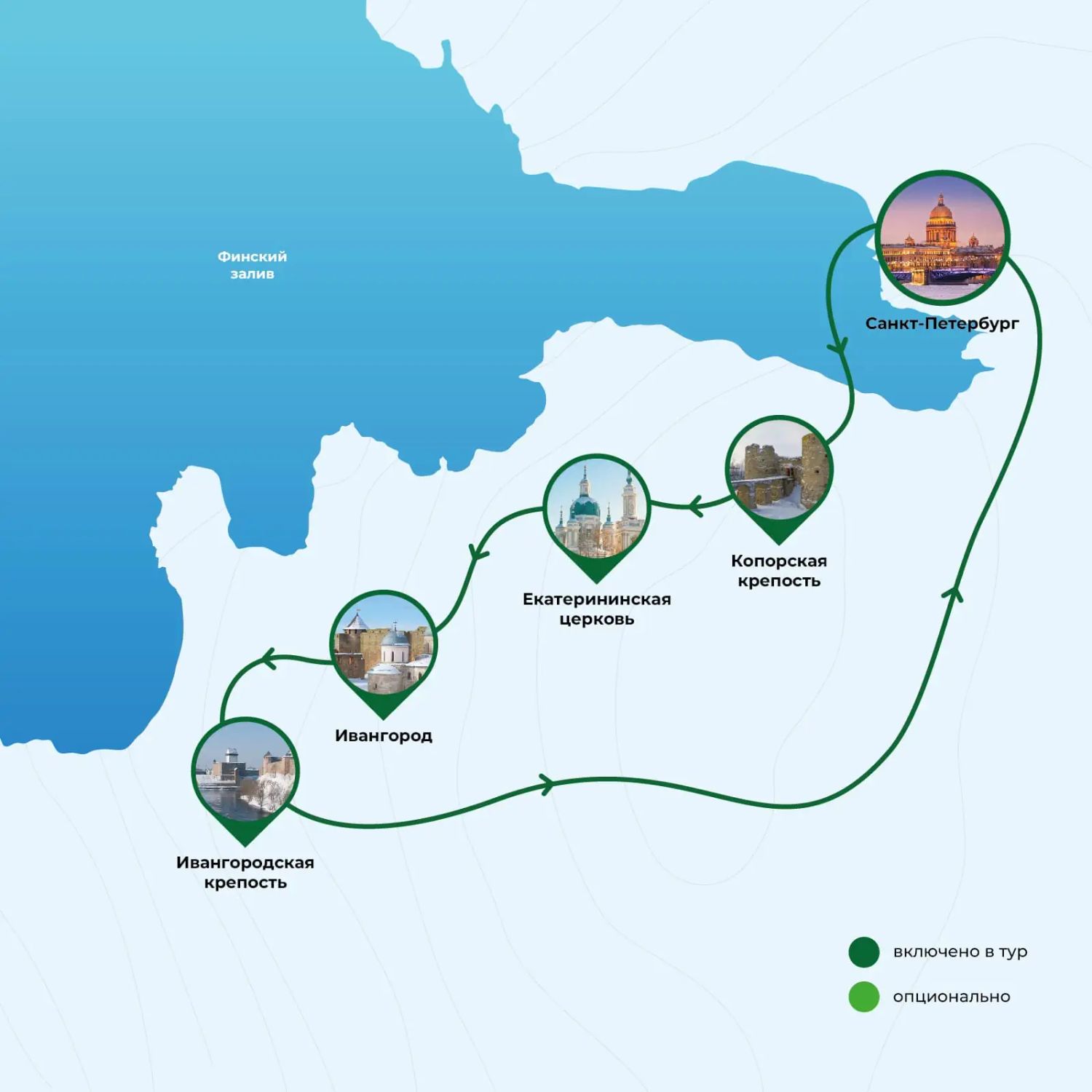- Санкт-Петербург - Копорье. Копорская крепость - Кингисепп. Крепость Ям - Екатерининская церковь - Ивангород. Ивангородская крепость - Санкт-Петербург