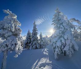 - -Зимой Конжаковский Камень превращается в ледяную крепость: скальные гребни, занесённые снегом, ледяные карнизы, ветер, выдувающий узоры на снежных полях.