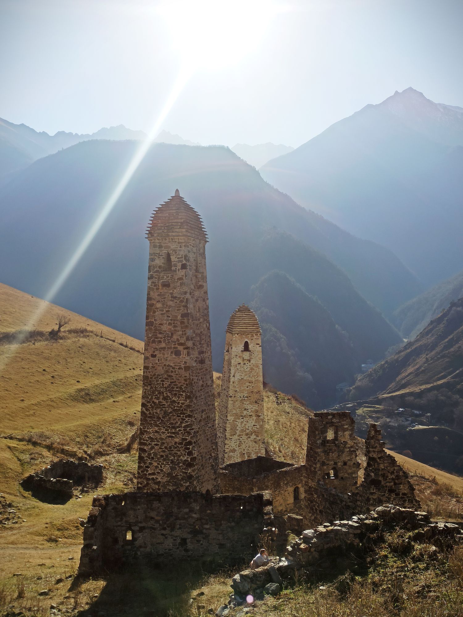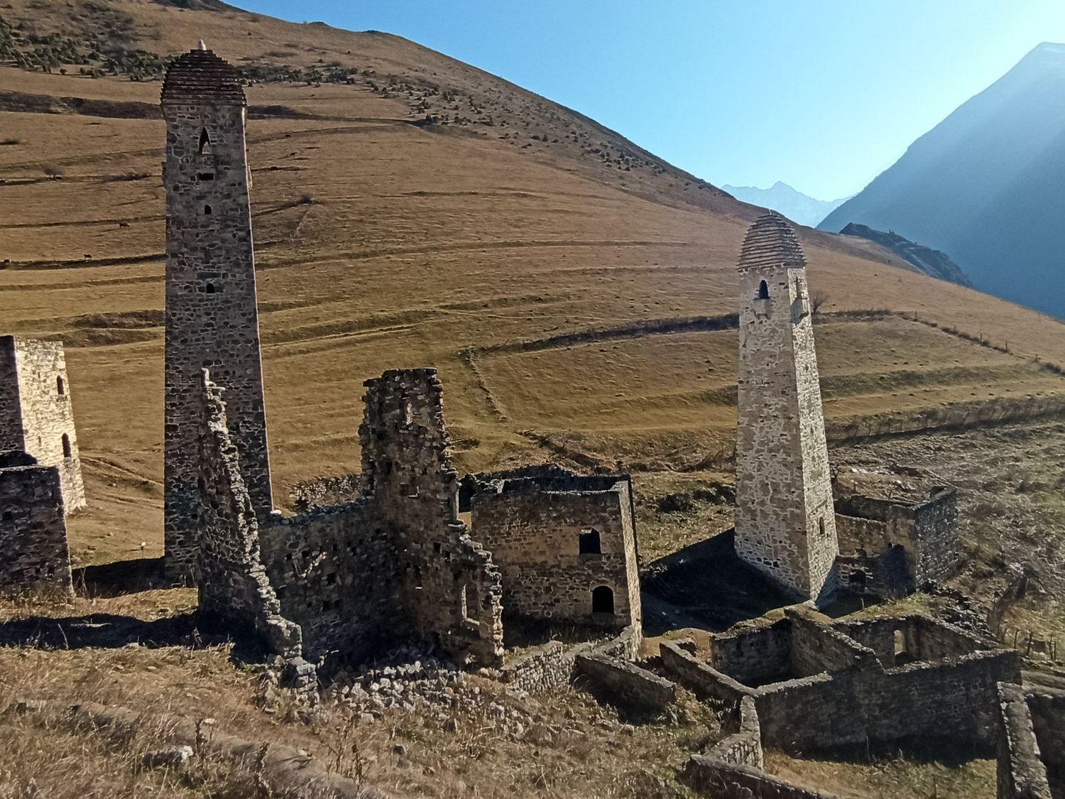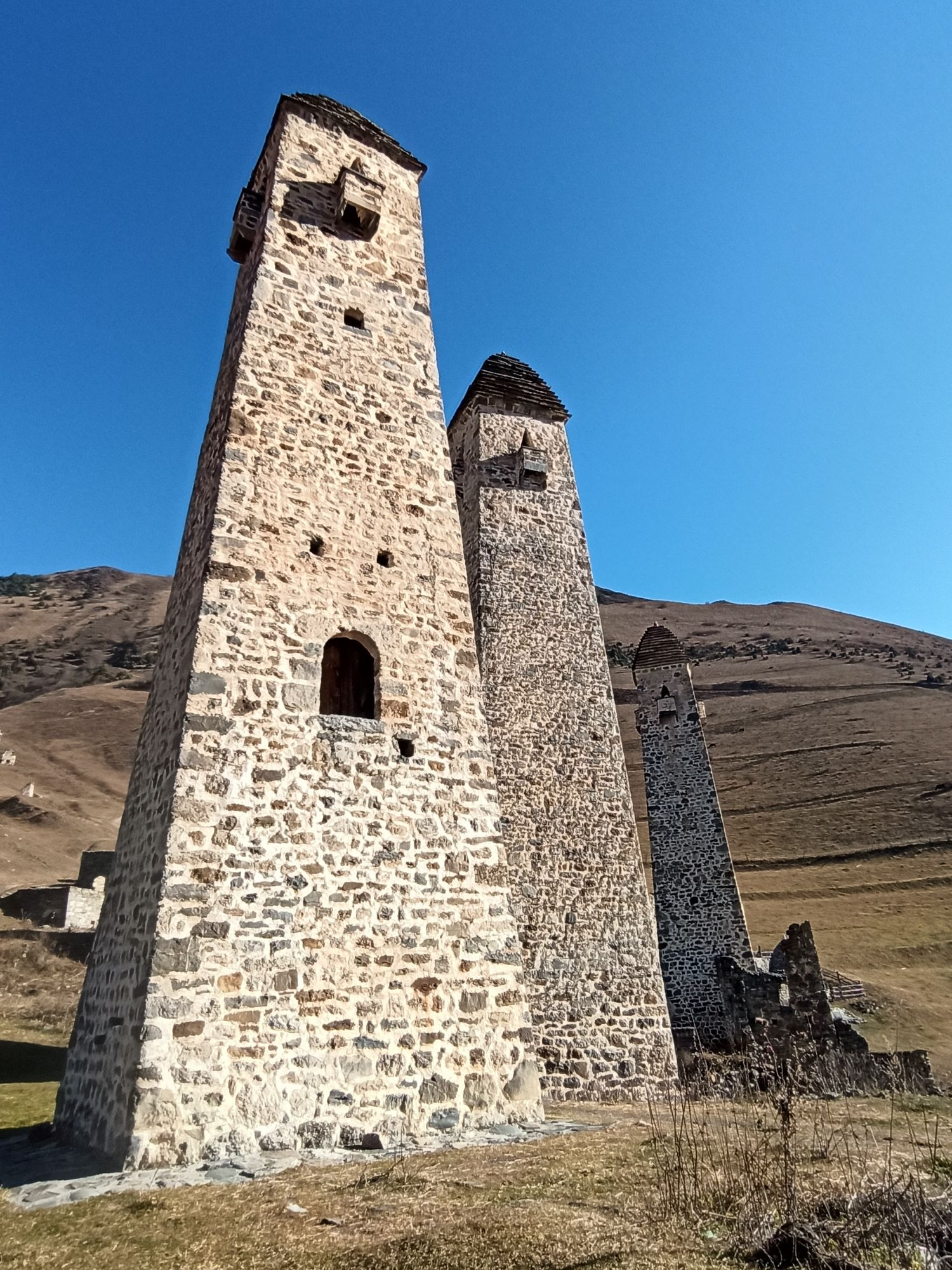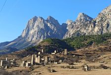Доезжаем до а. Ольгетти. Поднимаемся по тропе к Башенному комплексу Эрзи (0,5 км 15 минут). Эрзи (в переводе с ингуш. Орёл) — это один из самых знаменитых средневековых башенных комплексов в Ингушетии. Является объектом культурного наследия федерального значения. В комплекс входят: 21 жилая, 9 боевых, 2 полубоевых башен и группа наземных склепов. Башни в хорошем состоянии. Высота боевых башен достигает 2530 метров. Башни имеют 56 этажей. К боевым башням примыкают жилые постройки. Начало строительства датируется 8 веком. Боевые башни начали возводить после нашествия Тамерлана в 14 веке. К сооружению комплекса причастен знаменитый зодчий — Янд Строитель Башен.
