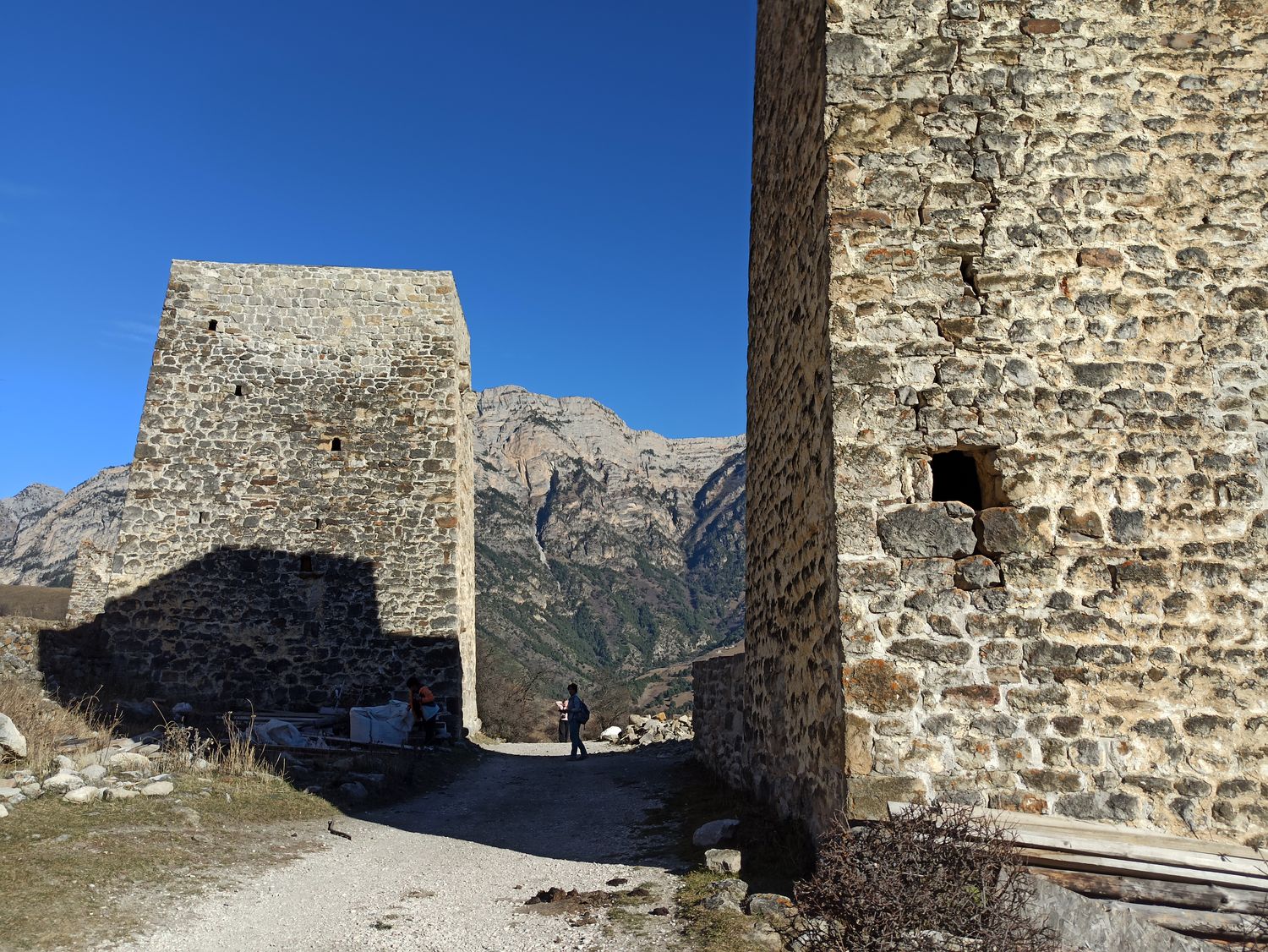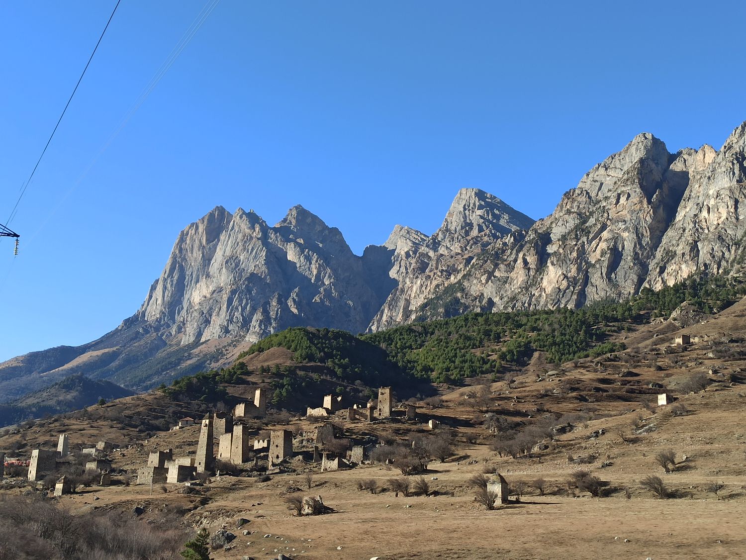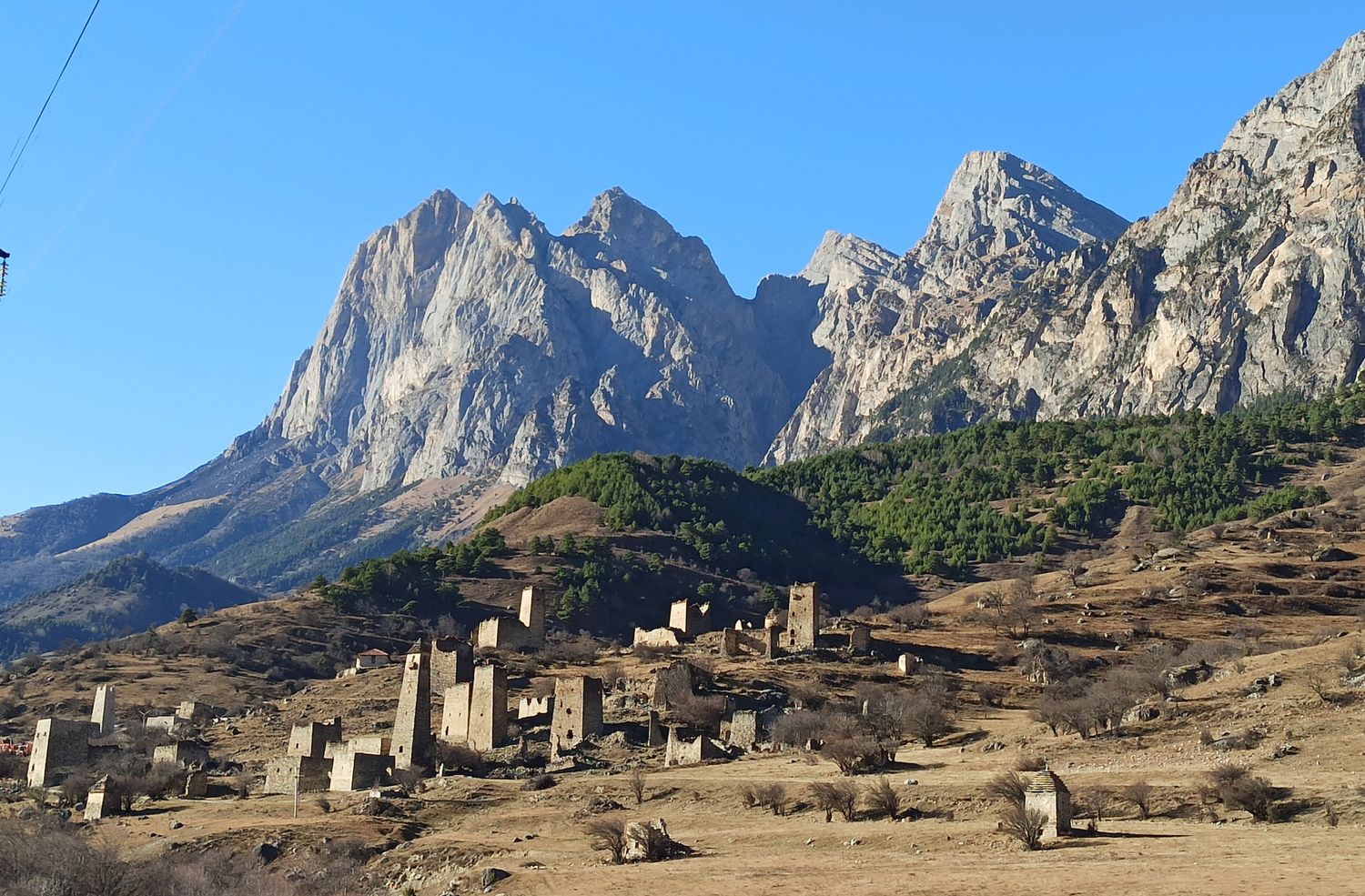 Доезжаем до а. Ольгетти. Поднимаемся по тропе к Башенному комплексу Эрзи (0,5 км 15 минут). Эрзи (в переводе с ингуш. Орёл) — это один из самых знаменитых средневековых башенных комплексов в Ингушетии. Является объектом культурного наследия федерального значения. В комплекс входят: 21 жилая, 9 боевых, 2 полубоевых башен и группа наземных склепов. Башни в хорошем состоянии. Высота боевых башен достигает 2530 метров. Башни имеют 56 этажей. К боевым башням примыкают жилые постройки. Начало строительства датируется 8 веком. Боевые башни начали возводить после нашествия Тамерлана в 14 веке. К сооружению комплекса причастен знаменитый зодчий — Янд Строитель Башен.