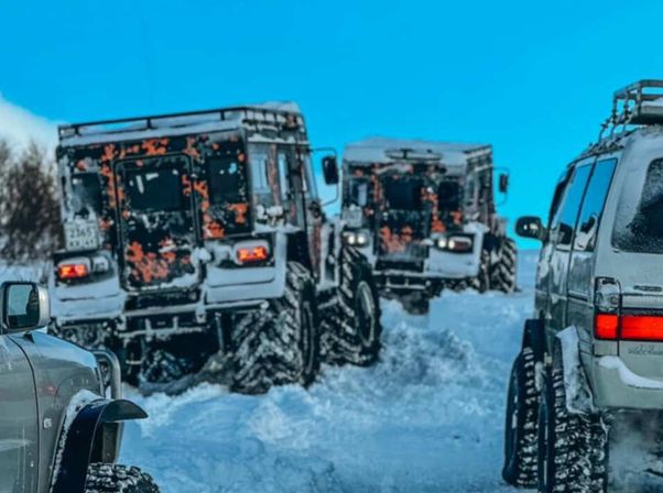 Один День : Тур На 6-ти Колесном Вездеходе -Это Пожалуй единственная возможность побывать в активной фумарольной Зоне в вулкана Мутновский . насладиться зимним Пейзажем Горных массивов и ощутить всю дикость и неприкосновенность Земли Санникова Трекинг на маршруте — 100 метров. Ходить совсем не надо ))) Впечатления первооткрывателя от этого тура — невероятная красота ,простота и величие нетронутых месть Планеты Земля !!! (цена на тур действительна до 28 декабря . далее повышение цены) Мутновский вулкан расположен южнее Петропавловска-Камчатского, рядом с вулканами Горелый и Вилючинский. Эти три вулкана называют южной группой вулканов. Расстояние до вулкана Мутновский приблизительно 120 км если двигаться по дороге. Первые 40 км вы едете по асфальту. В районе поселка Термальный сворачиваете на грунтовую дорогу, ведущую к Мутновской геотермальной электростанции. Дальше скорость движения зависит от состояния дороги. Через несколько часов, двигаясь с остановками чтобы размять ноги и пофотографировать, вы подниметесь по горному серпантину на Вилючинский перевал. Высота перевала максимальная 1100 метров, в том месте, где проходит дорога — около 900 метров. Зимой здесь выпадает до 6ти метров снега и движение тяжелого автотранспорта (Камазов и Уралов) на Геотермальную станцию осуществляется по снежному тоннелю, пробитому тяжелыми тракторами. С перевала открывается вид на вулканы Вилючинский (2173м), Горелый (1829м) и Мутновский (2323м). Кроме того хорошо видна долина реки Паратунка и Мутновское плато (700м). Здесь и начинается самое интересное путешествие, которое зимой доступно только на шестиколесном вездеходе. До марта месяца, когда уже теплеет до -10-15С на Мутновский вулкан снегоходные экскурсии как правило не проводятся. Слишком холодно в нартах и на снегоходе. Внутри теплого вездехода такой проблемы не существует. Можно с комфортом добраться до Мутновского вулкана, по пути наслаждаясь видом окрестных вулканов, заснеженного плато и обилием снега, искрящегося на солнце. (В плохую погоду экскурсия не проводится). Вездеход позволяет с комфортом добраться до вулкана и посмотреть на вулкан и на каньон Опасный с 30-ти метровым водопадом. Затем вездеход переедет по склону вулкана на противоположную сторону к Мутновской геотермальной станции, термальным полям и горячим источникам, именуемым Дачные. Так их прозвали геологи, изучавшие этот район. Дачные горячие источники имеют выходы термальной воды, грязевые котлы и выходы серы, и по внешнему виду напоминают знаменитую Долину гейзеров, но без гейзеров. После осмотра термальных полей и горячих источников можно пообедать ланч-боксами, которые вам предоставит гид-водитель, и направляться в обратный путь. По ситуации, в зависимости от температуры воздуха оставшегося времени, на обратном пути можно попробовать искупаться в открытых диких горячих источниках. Не забудьте взять с собой тапочки, большое банное полотенце и купальный костюм! Эта зимняя поездка на шестиколесном монстре по зимней Камчатке запомниться вам своей необычностью и комфортом !