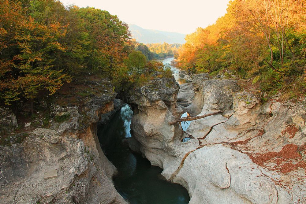 После завтрака отправляемся к первой достопримечательности - Хаджохской теснине. Место совершенно невероятное и очень живописное. Потоки реки Белая прорезали извилистый узкий коридор в толще известнякового пласта, образовав скальные останцы причудливых форм. Центральная часть теснины оборудована площадками и переходами. На прилегающей территории расположены вольеры с дикими животными.