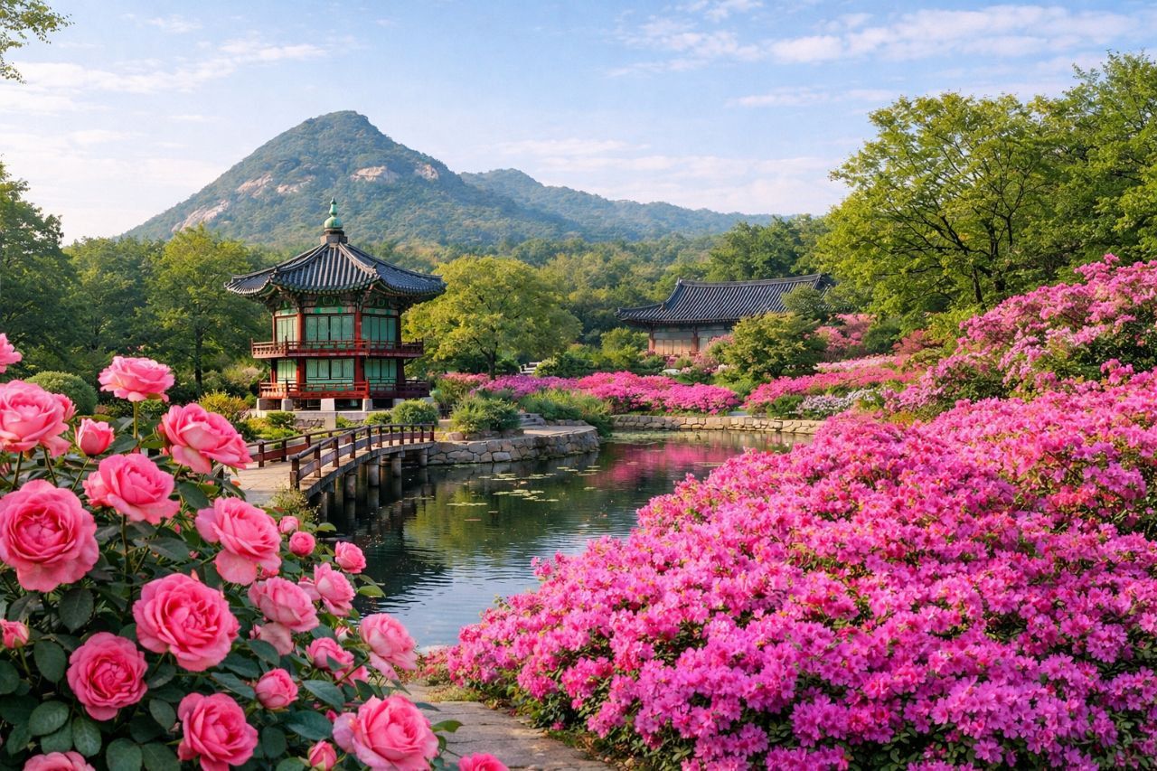 Май в Корее — это магия. Представьте, как идеальная весенняя погода, тёплая, но не жаркая, соединяется с фантастической картиной: древние дворцы утопают в розовой дымке цветущих роз и королевской азалии, а горные тропы зовут на прогулку по изумрудной зелени.