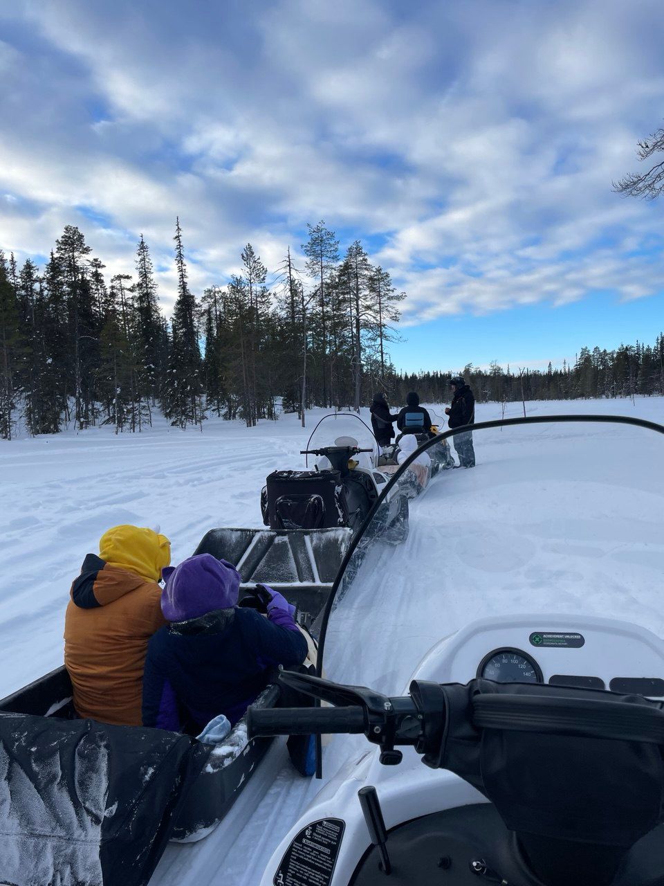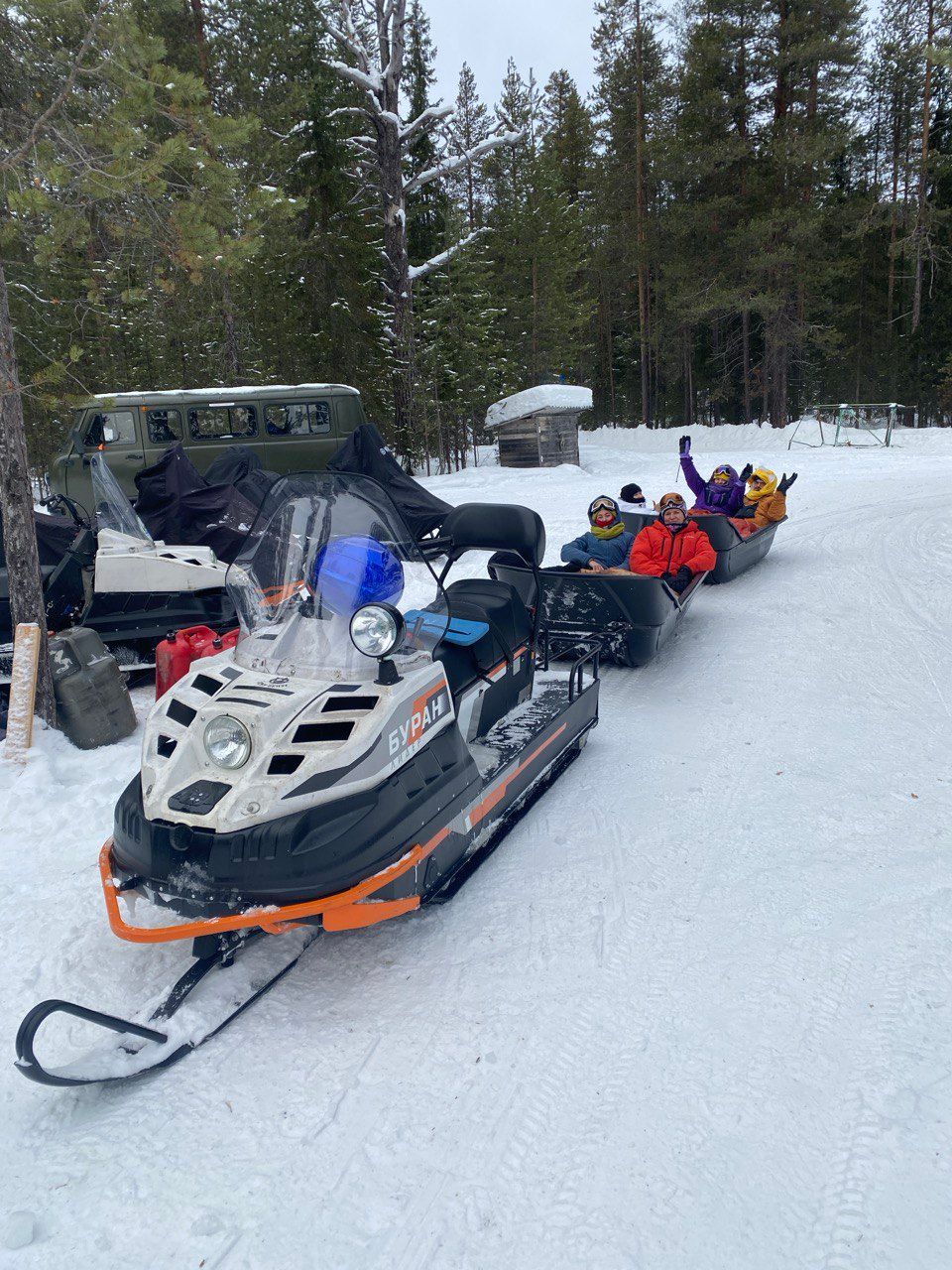Начало приключения: пересадка на снегоходы с санями и путь сквозь заснеженную тайгу к нашему уединённому пристанищу.