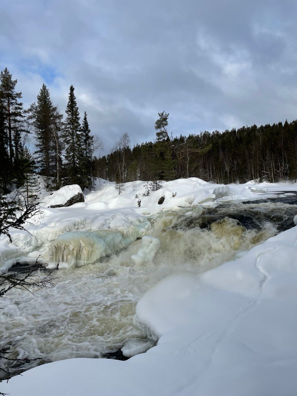 - Порог Киваккакоски — неукротимый поток, чёрные воды которого с рёвом разбиваются о ледяные скалы, разрывая зимнее безмолвие.