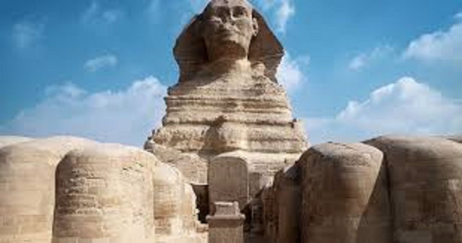 - Рядом стоит загадочный Сфинкс с телом льва и лицом фараона — символ силы и мудрости