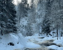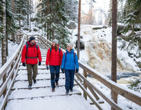Нас ждёт одно из самых живописных мест этого маршрута - Долина водопадов. К ней ведёт эффектная деревянная лестница, а в конце тропы - точная копия старинной мельницы, стоявшей здесь 200 лет назад. Вокруг - заснеженные ели, шум воды и чистейший морозный воздух.