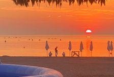вечерний закат, окрашивающий воду в золотые и розовые тона;