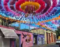 - Множество разноцветных скелетов, украшающих стены домов и улицы городов