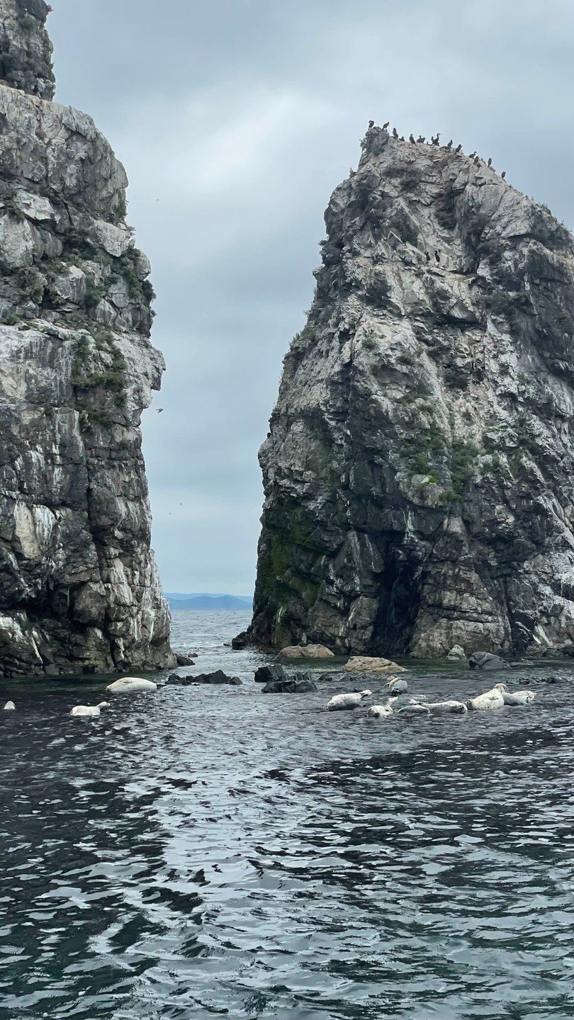 10:00 — прибытие на пирс в пос. Дунай, посадка на катер. Начнём с посещения Бакланьего камня и маяка, который стоит на границе пролива Аскольд. Далее — путь к островам Унковского, где вы сможете увидеть милых тюленей ларга, отдыхающих на скалах или плавающих в море.