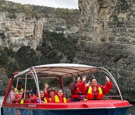 Затем нас ждёт катание на катерах по бирюзовой воде Чиркейского водохранилища — крупнейшего водохранилища Северного Кавказа. Для наших путешественников мы организуем расширенный маршрут катания: через Чёртов палец — скалу-останец, залив Изумрудный — единственное место, где вода зимой не замерзает, а также руины древнего аула.