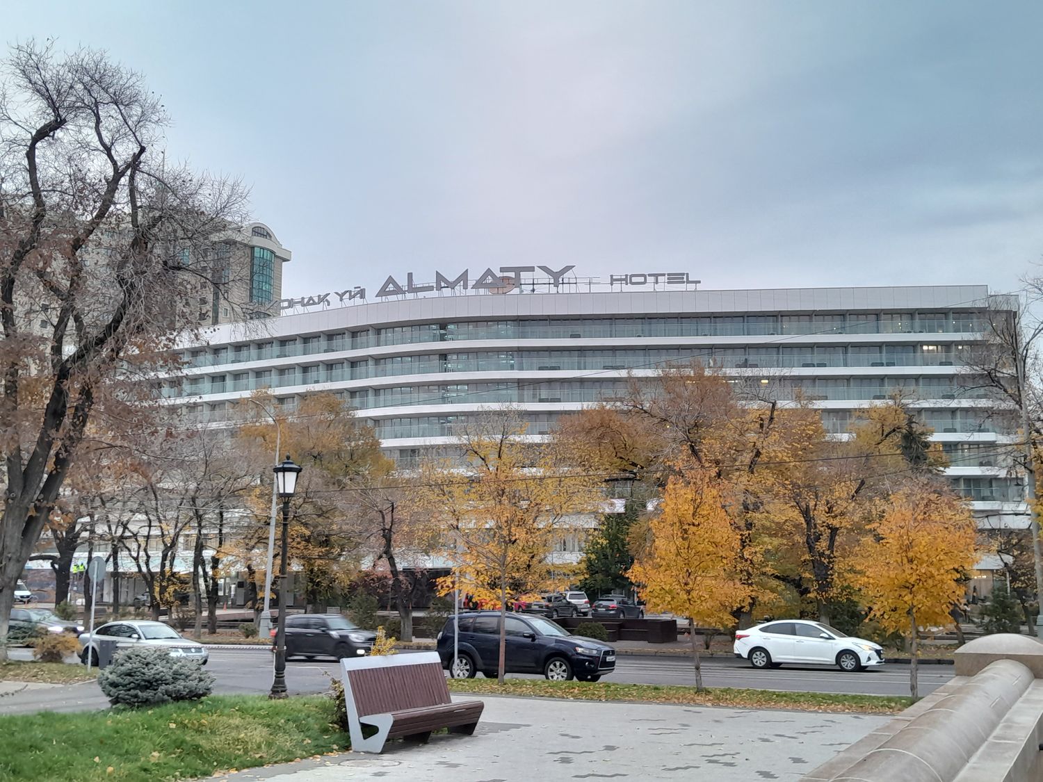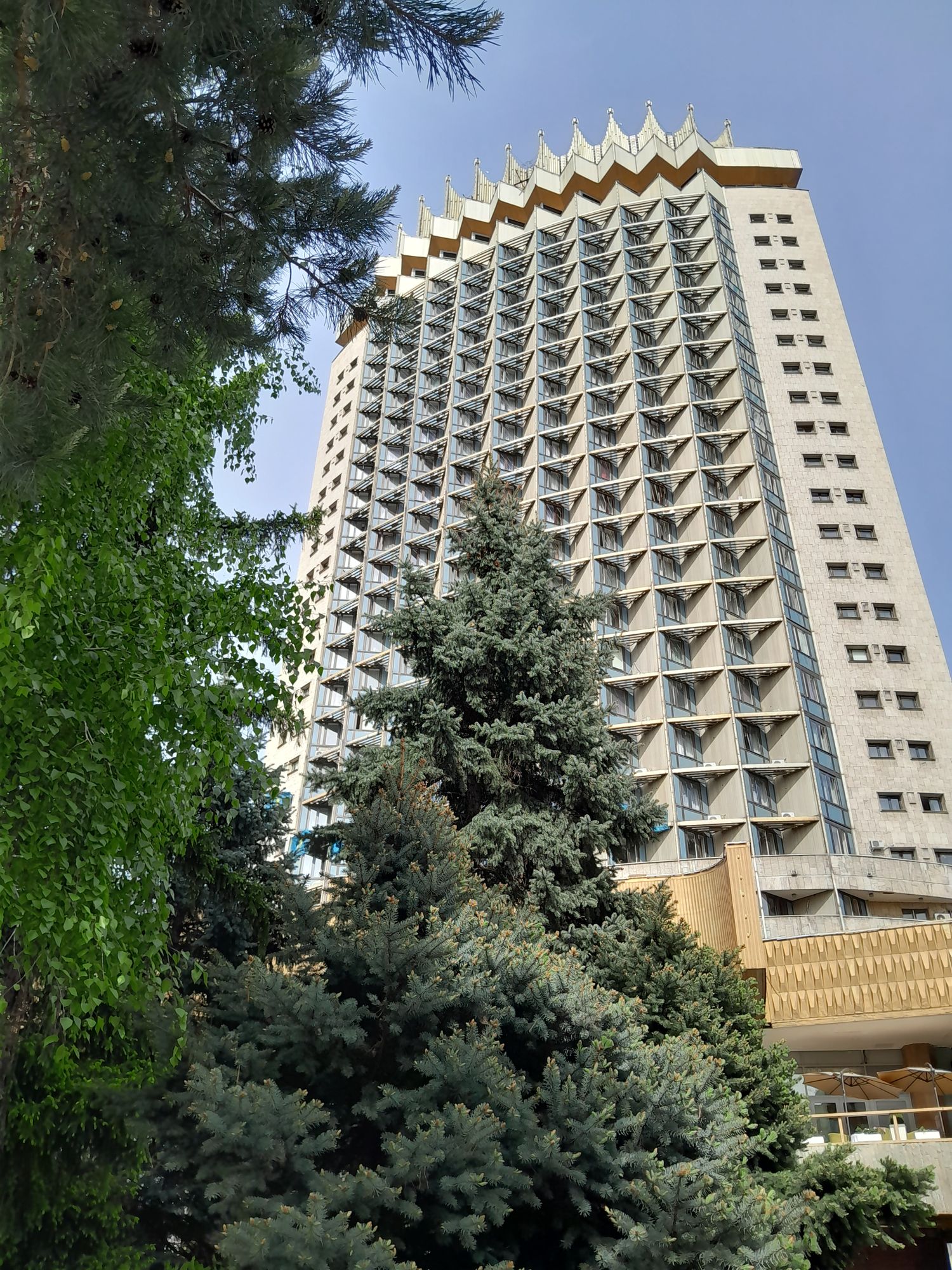 Особое внимание привлекает Гостиница Казахстан — 26-этажный символ Алматы, построенный в 1977 году. Здание известно своей сейсмоустойчивостью.