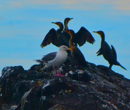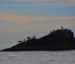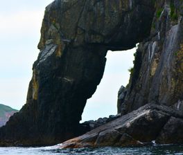 11:00-15:00 посадка на катер в заливе, катерная экскурсия мимо полуострова Брюса, остановка на кекуре Колонна (лежбище тюленей ларга), выход на нескольких островах в зависимости от ветра и волны (как правило, на островах Моисеева, Желтухина и Рикорда), купание на одном из островов;
