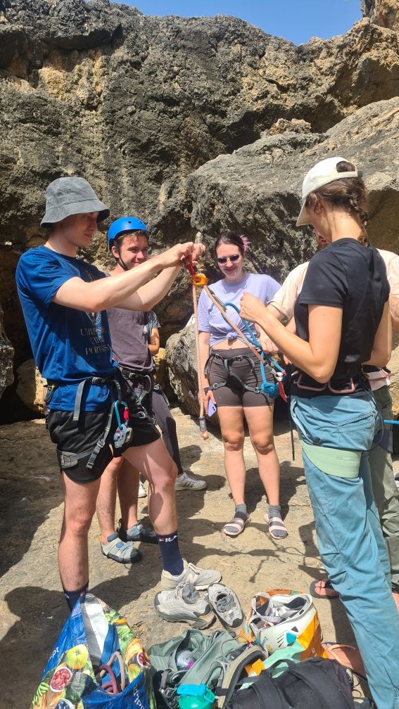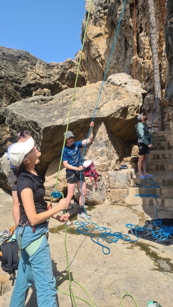 - Оборудование и безопасность. Показываю обвязку, верёвку, страховочное устройство. Объясняю, как работает система верхней страховки. Проверяем друг друга. Учимся страховать друг друга.
