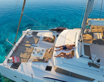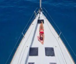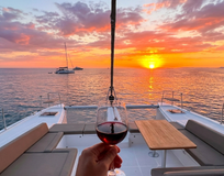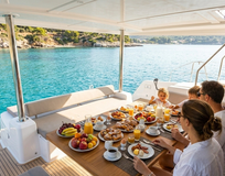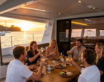 Вы поднимаетесь на борт во второй половине дня. Катамаран уже готов — прохладные каюты, лёгкий аромат моря, приветственный напиток.
