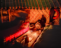 - Мы построили уютный лагерь в уникальном месте — прямо на острове. Сердце лагеря — настоящая монгольская юрта, где тепло, светло и по-домашнему. Внутри — дровяная печь, оленьи шкуры, медные подсвечники, мягкий свет и ощущение, что ты попал в сказку.