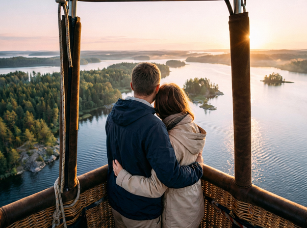 Внутри — вау-моменты, которые выглядят как сцены из фильма: полет на воздушном шаре на рассвете/закате с шампанским, Ладожские шхеры на катере с высадками на уединённые острова, мраморная Рускеала и Подземные гроты, и финал на ретропоезде 19 века с живой музыкой. А жить вы будете у Ладоги — там, где отдых действительно происходит: прогулки у воды, закаты, уют и возможность Spa.