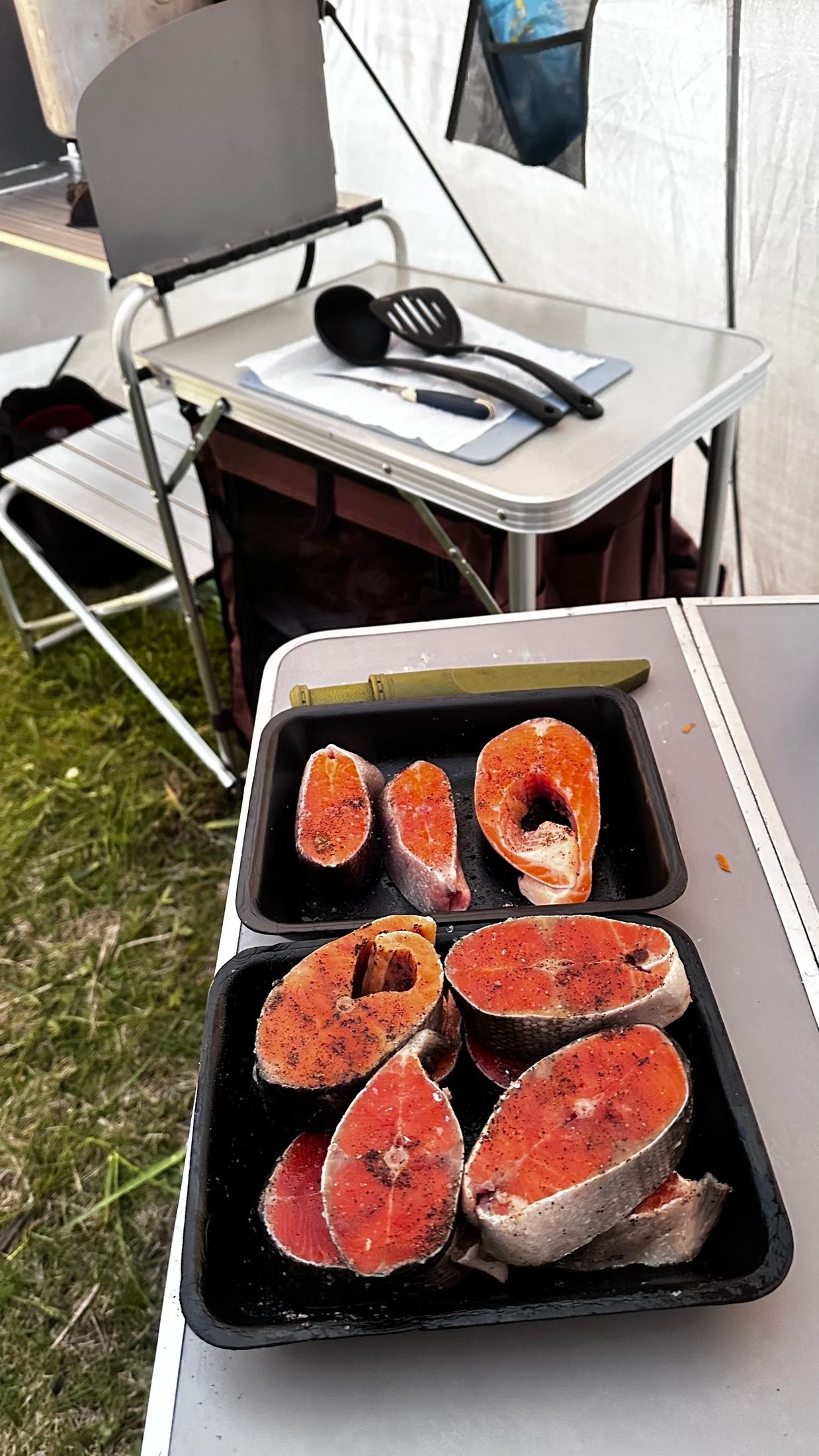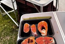 20:00 ужинаем. Кормим вкусно! Шашлык, уха, паста и курица со сливками. Мы постарались что бы меню было максимально вкусным в диких условиях бездорожья и отрыва от цивилизации. На полуостров Рыбачий мы везем продукты в дорожном холодильнике.