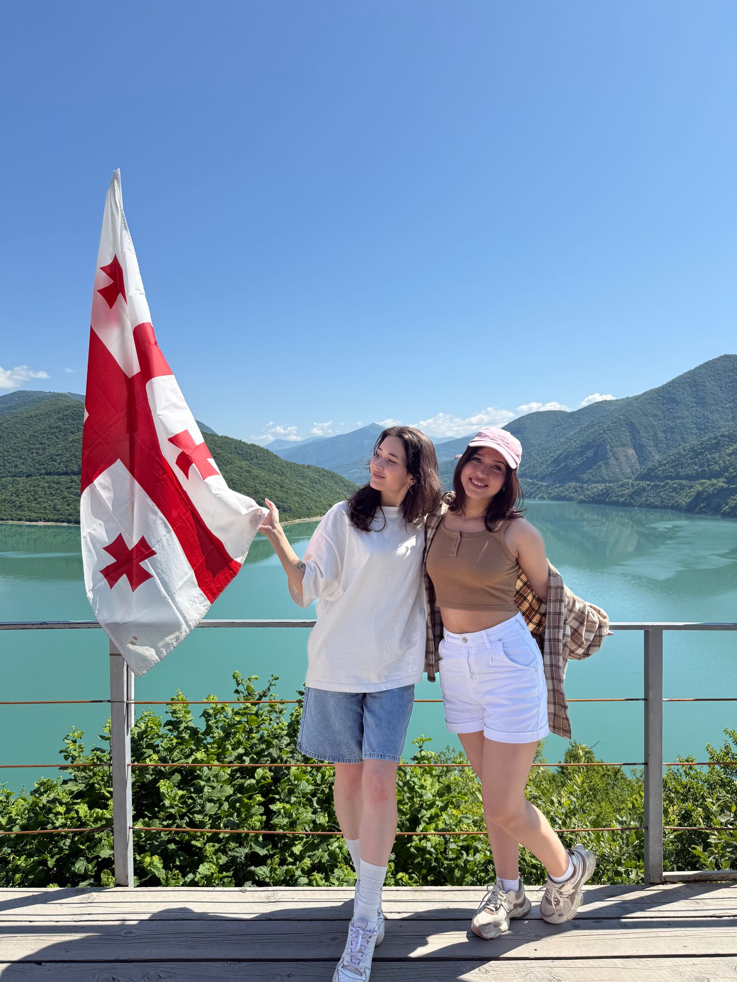 Старт в 09:00 из Тбилиси, и уже вскоре нас встречает изумрудная гладь Жинвальское водохранилище. Здесь делаем первую остановку для фотографий и наслаждаемся горным воздухом.