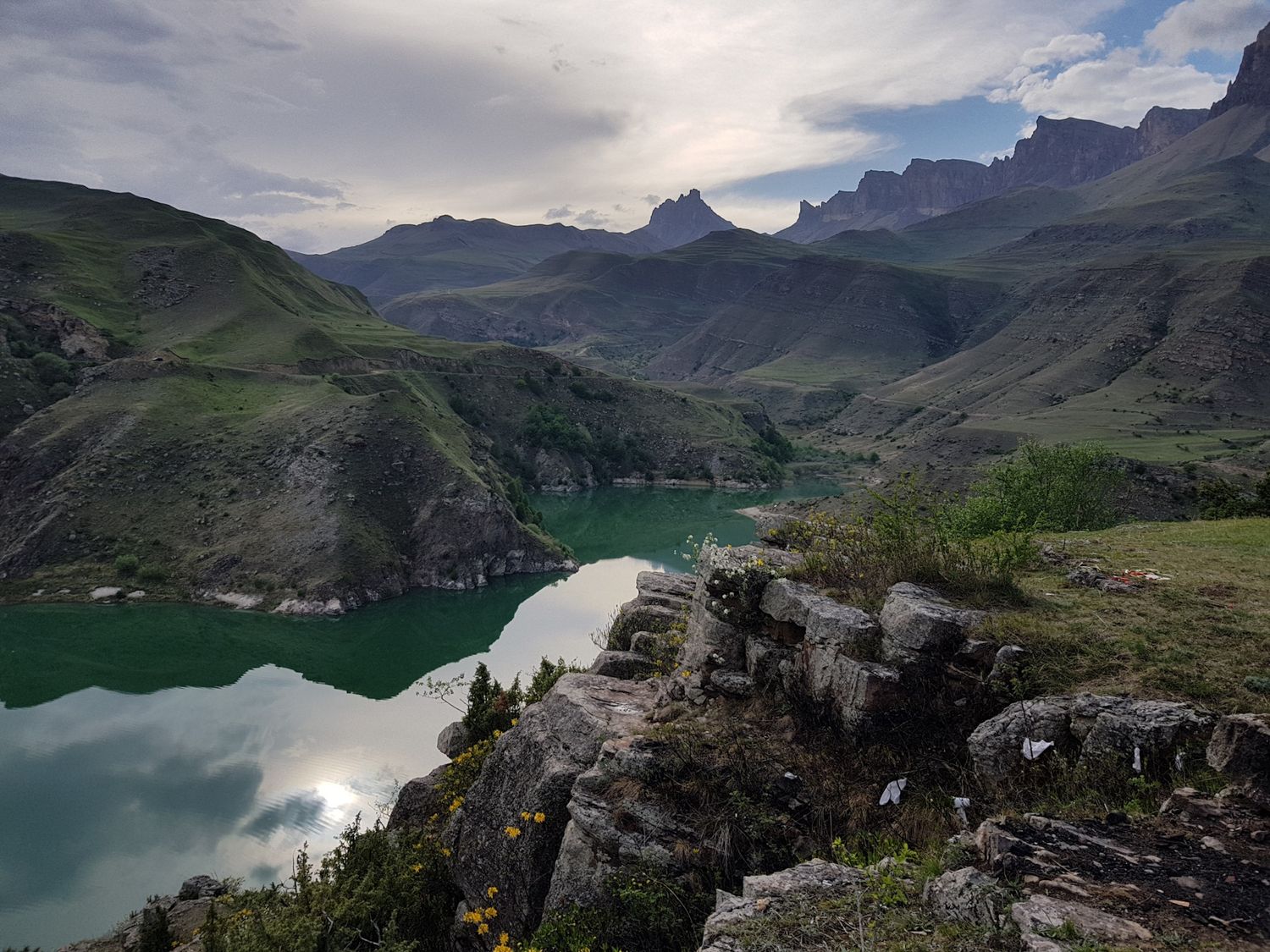 Плато Шаджатмаз. Первая остановка на высоте 2100 метров. Отсюда открывается чарующая панорама Кавказского хребта .