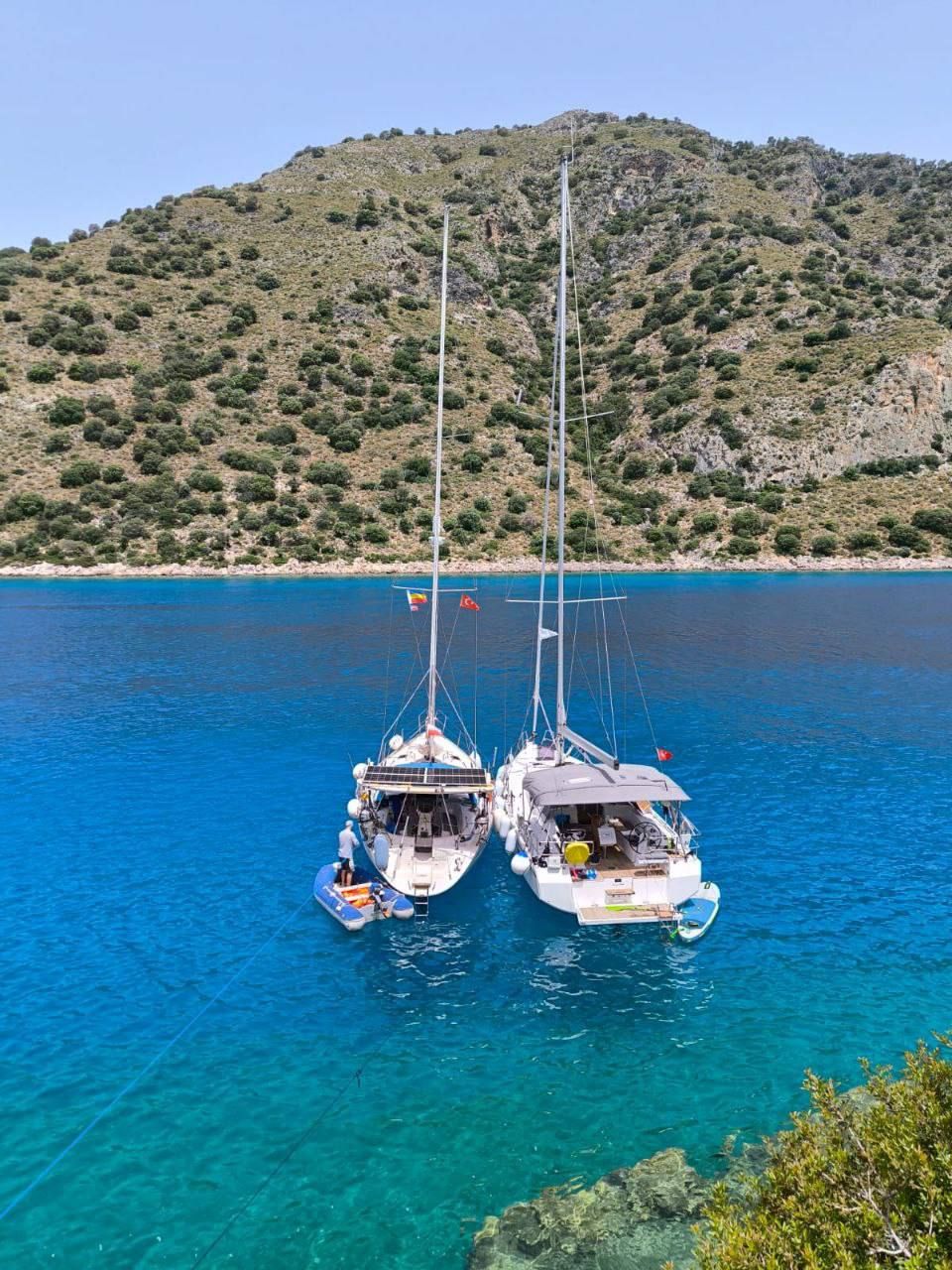 - Яхта стоит на якоре в тихой бухте, вокруг горы и прозрачная вода.