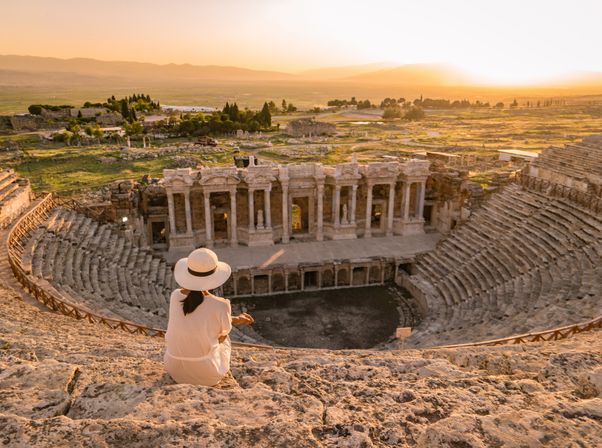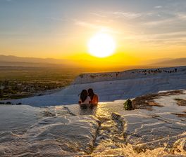 Античный Хиераполис в сумерках превращается в город теней. Вы пройдёте по мраморной улице, где колонны отбрасывают длинные полосы. Театр на 12 тысяч зрителей пуст, но закат оживляет резные лица богов на сцене. У храма Аполлона Плутоний — Врата в Аид — в сгущающихся сумерках кажется особенно зловещим. Некрополь с тысячами саркофагов тянется к догорающему горизонту. А в бассейне Клеопатры вы погрузитесь в тёплую (36C) воду, пузырящуюся как шампанское, а на дне под вашими ногами — настоящие мраморные колонны рухнувшего храма. Купаясь среди обломков древности под закатным небом, вы станете частью легенды, где история обнимает вас тёплой водой.