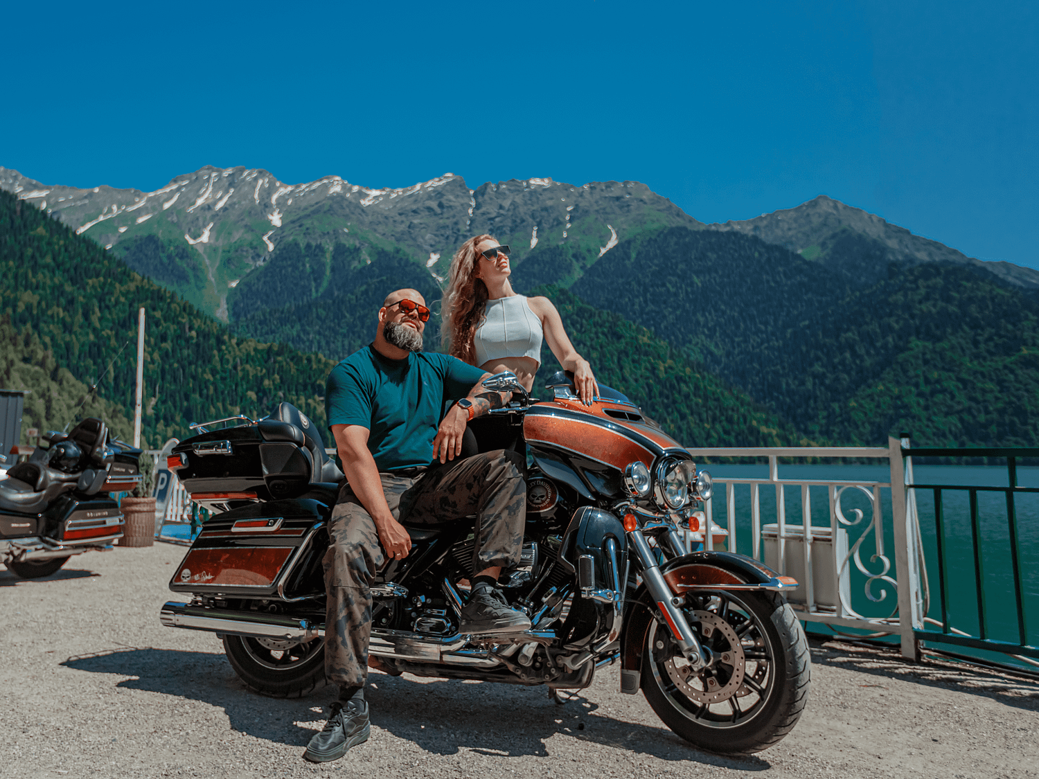 Уедем на мотоцикле в самое сердце горной Абхазии — к бирюзовому озеру Рица, спрятанному на высоте 700 метров среди величественных ущелий. По пути — кристальная река Бзыбь, стеклянный мост над водой в ресторане Абхазский двор, а на обратном — закатное море и архитектура Старой Гагры.