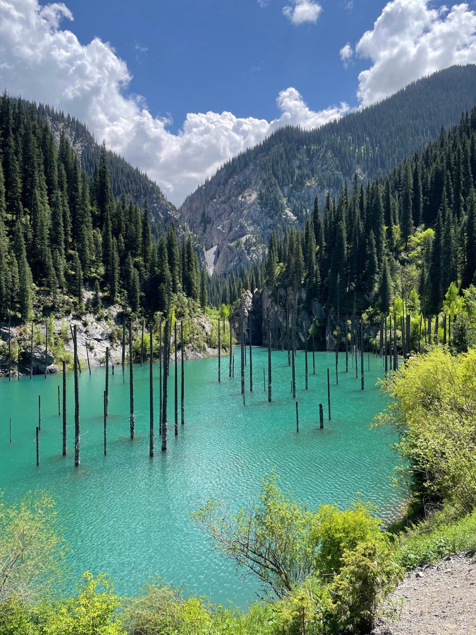 Большое Алматинское озеро находится высоко в горах недалеко от Алматы. Оно известно своей яркой бирюзовой водой, цвет которой меняется в зависимости от погоды, освещения и времени года. Озеро расположено на высоте около 2500 метров над уровнем моря.