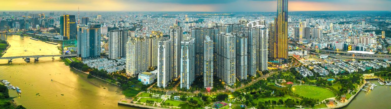 - Са́йгон‑Скайдек на башне Bitexco: панорамный вид на изгибы реки и вечерний океан огней.