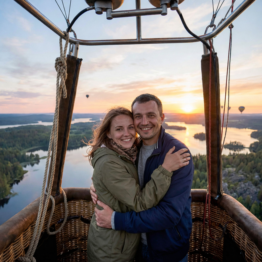 Это девичник, который выглядит как маленькое кино: рассвет над карельскими лесами с высоты воздушного шара, бирюзовый мрамор Рускеалы, шхеры Ладоги с высадками на острова — и финал на ретропоезде 19 века с бархатом, живой музыкой и шампанским. За 3 дня