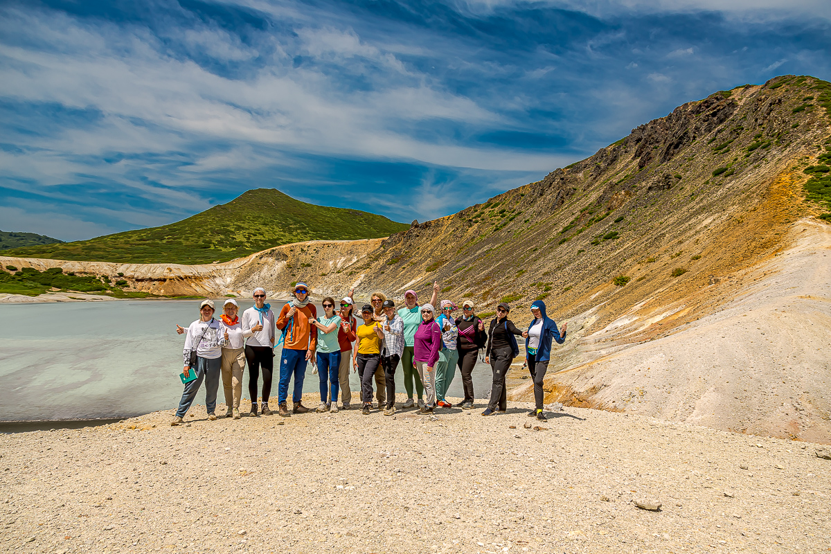 У нас был насыщенный маршрут. Мы увидели все самое красивое и даже то, что скрыто от глаз широкой публики. Исследовали действующий вулкан Менделеева с его фумарольным полем и дышащими паром сольфатары. Спускались в кратер (кальдеру) потухшего вулкана Головнина, купаться в озере Горячем и в Охотском море, гулять в отлив по берегу Тихого океана с его отвесными скалами (Головнинский клиф) и водопадами, а вишенкой на торте был мыс Столбчатый, где я встретила свой День рождения!